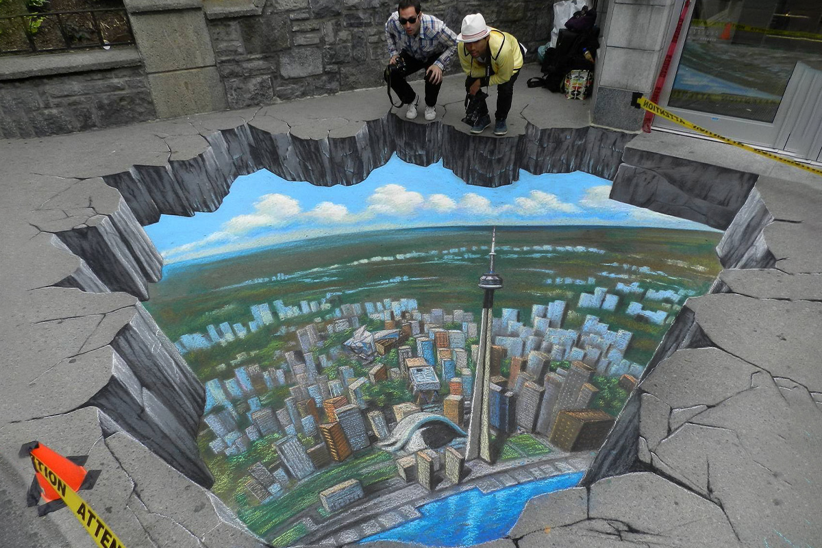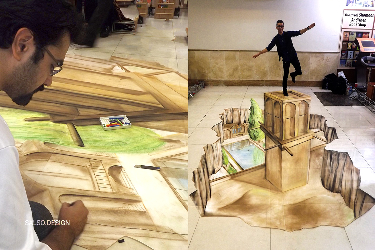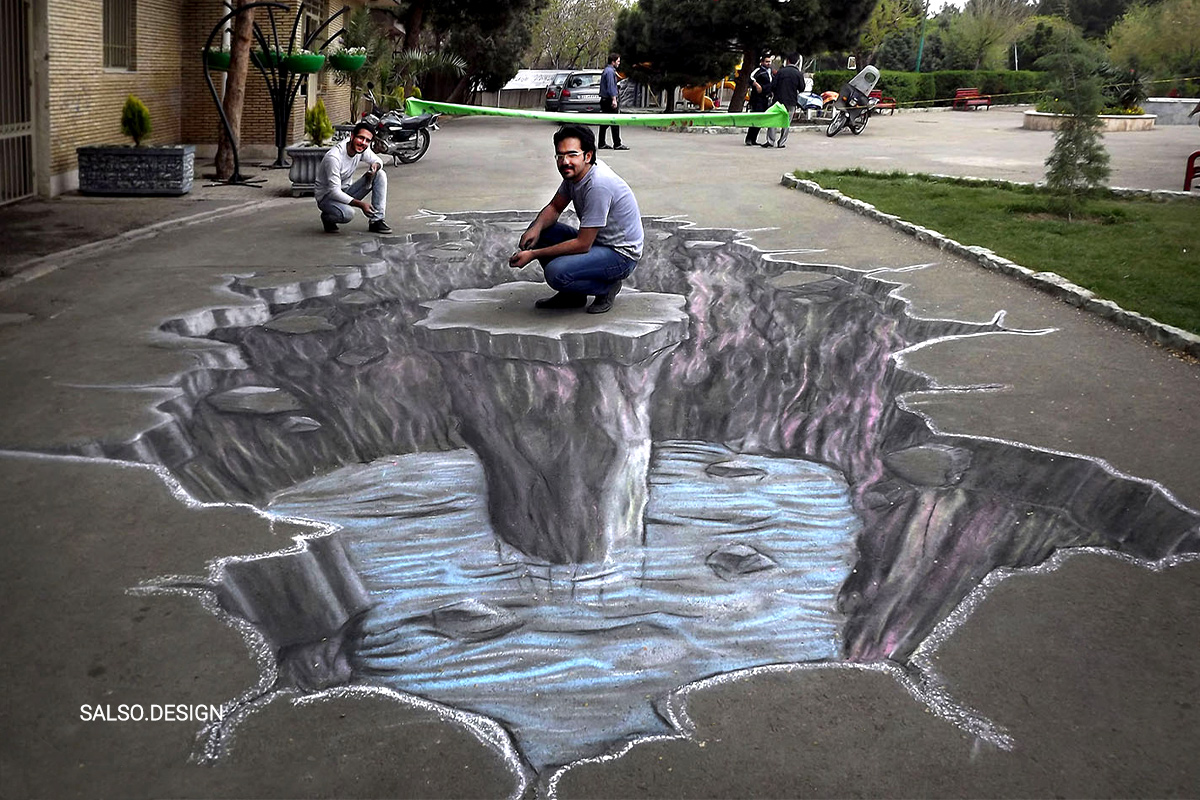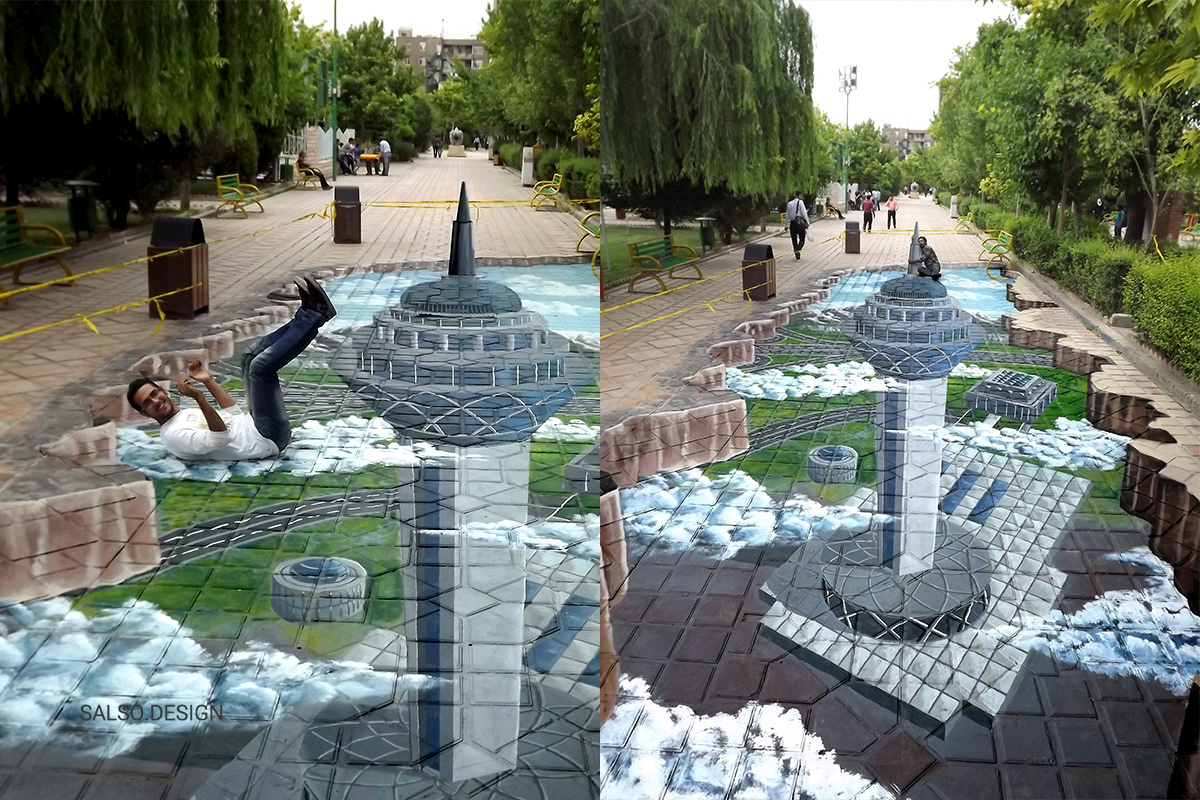 Street art is a form of contemporary art created in public spaces rather than traditional galleries or museums. It includes various styles such as graffiti, stencil painting, posters,urban collages and 3d street art. One particularly fascinating branch of street art is optical illusion design, which has gained a large following. This style relies on perspective techniques and is often made with chalk on sidewalks or walls, creating a three-dimensional effect. Some of the well-known artists in this field include Kurt Wenner from the United States, Julian Beever from the United Kingdom, Leon Keer from the Netherlands, and Saleh Sokhandan from Iran.
