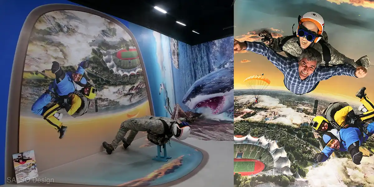 This double-sided 3D floor-and-wall mural of skydiving wraps smoothly over the wall curve and onto the ground for a dramatic skydiving free-fall scene. Visitors can stand in and take unique photos to share with their friends on social media!