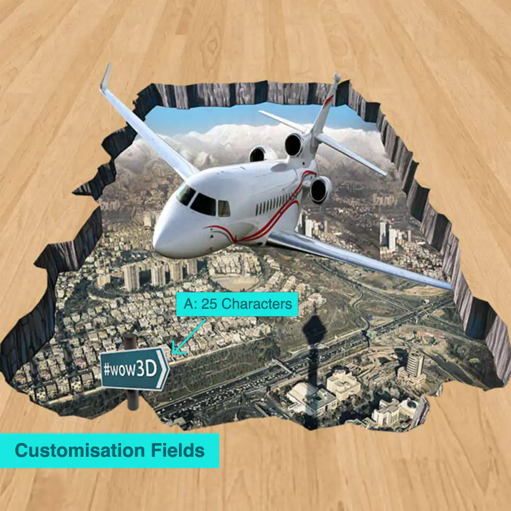 Airplane comes out of big hole top a city 3D floor sticker [cutomizable text]