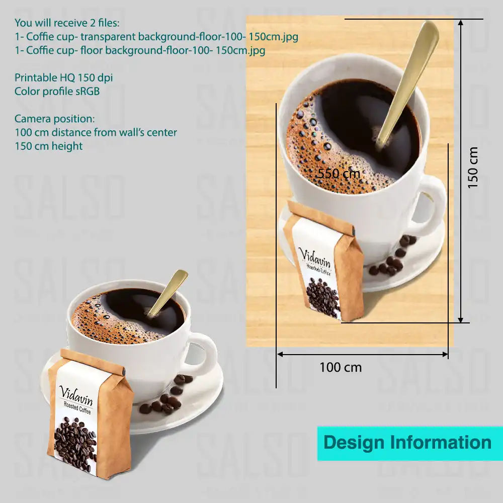 - The ideal size for the wall is three by 3 meters. This ensures the ‘Cup of coffee beside a coffee bag’ 3D mural fits ideally and is manageable enough to appreciate the 3D effect. The minimum width you can fit the mural inside is 2.4 meters. A white background version of this design would be more suitable if you have a larger wall.