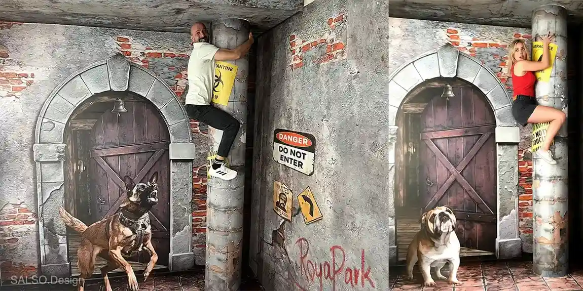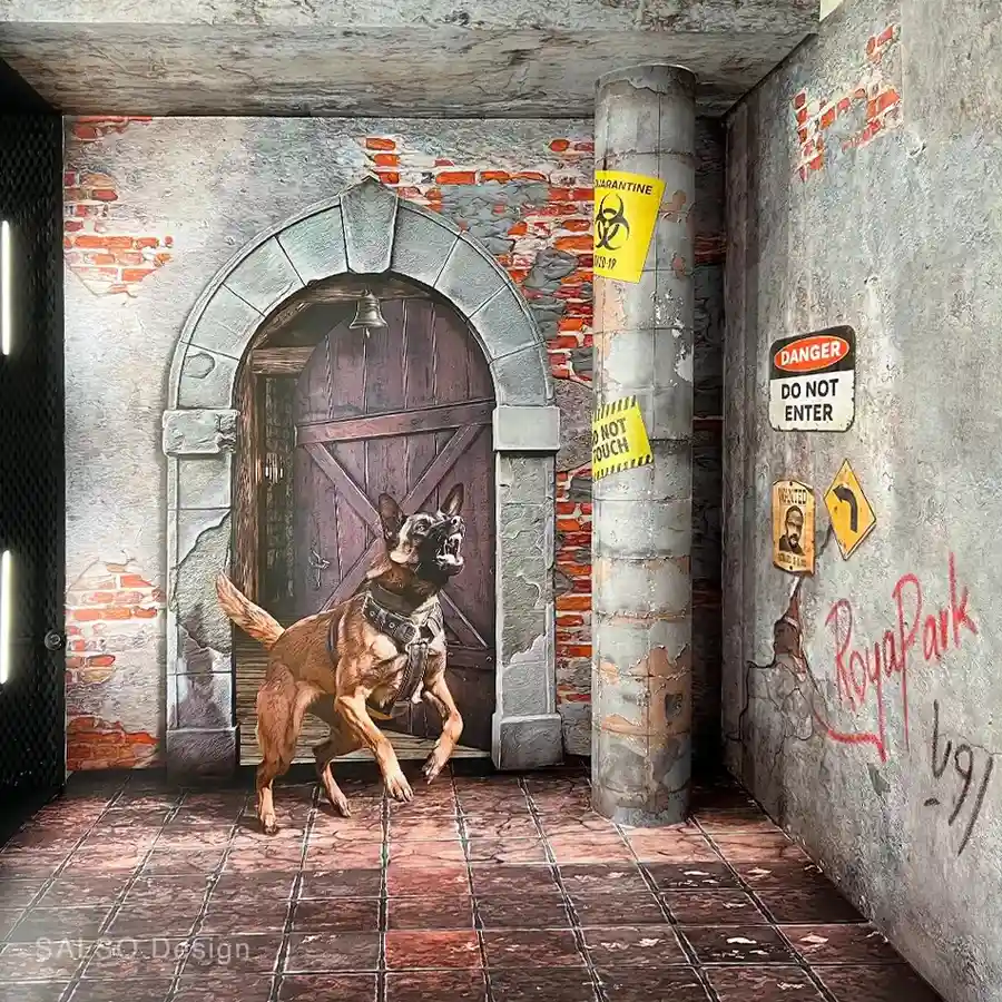 The dog’s house mural is a 3D photo zone that brings visitors into an exciting guard-dog chase scene. It feels like you have stepped into a fun danger zone with cracked concrete walls, warning signs, an old wooden door, and a powerful dog lunging forward.