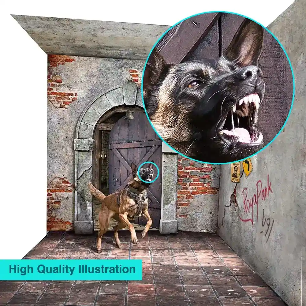 The installation covers roughly 3 meters in height and 5 meters in width, featuring cracked concrete textures, bold warning signs, an old wooden door, and a fierce guard dog lunging forward. It’s the ultimate outside dog mural, capturing that raw watchdog energy.