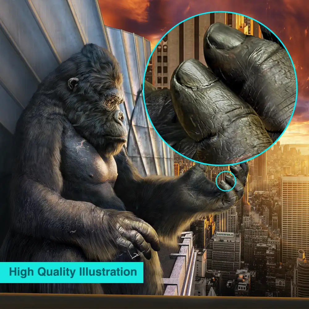 This immersive artwork creates the illusion of stepping right into the climax of an epic movie. With lifelike textures — from Kong’s detailed fur and expressive eyes to the glowing sunset over the skyscrapers — it turns any wall into a stage for adventure. Visitors can “pose” in Kong’s hand or stand beside him for photos that practically roar off the screen.