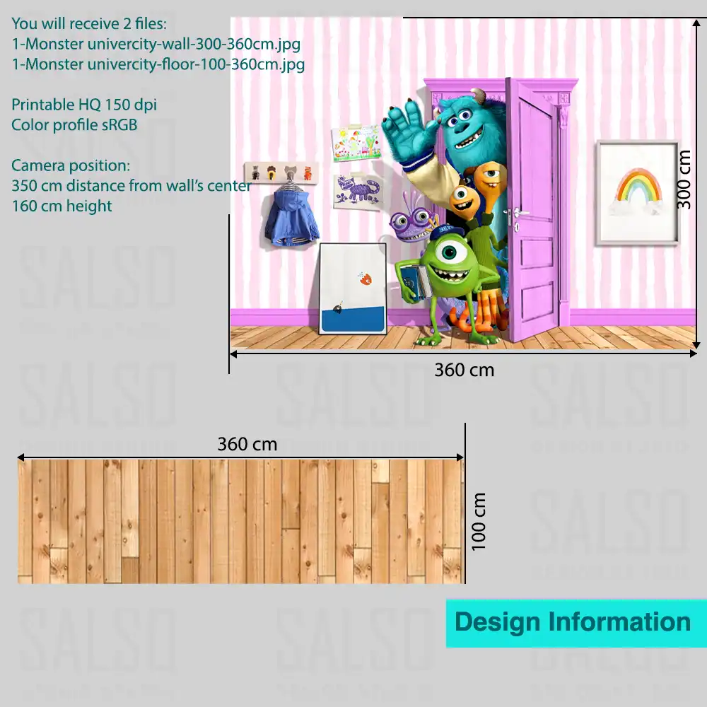 - The ideal size for the wall is three by 3 meters. This ensures the ‘Monster university characters’ 3D mural fits ideally and is manageable enough to appreciate the 3D effect. The minimum width you can fit the mural inside is 2.4 meters. A white background version of this design would be more suitable if you have a larger wall.