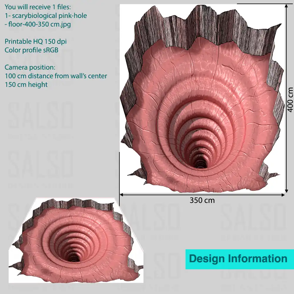 - The ideal size for the wall is three by 3 meters. This ensures the ‘Scary biological pink hole’ 3D mural fits ideally and is manageable enough to appreciate the 3D effect. The minimum width you can fit the mural inside is 2.4 meters. A white background version of this design would be more suitable if you have a larger wall.