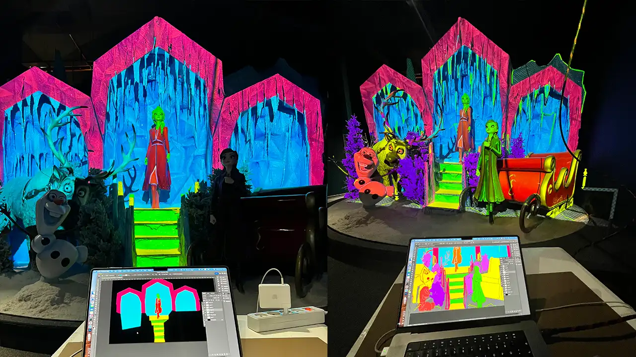 • Star Wars Preshow demonstrated how a single projector can deliver two distinct experiences. With one computer, one projector, and thoughtful set design, visitors experienced two different techniques simply by changing their viewing position. One approach used back projection across multiple surfaces, while the other focused on projection mapping onto sculptures and physical forms.