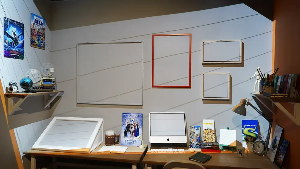 In our Animation Studio project, for example, we designed a small 10-square-meter room to resemble an animator’s workspace, fully aligned with the projection idea. Using a single projector with an integrated sound system and 4K support, we projected content onto two walls and a table. A simple but carefully engineered setup created an engaging experience for visitors.